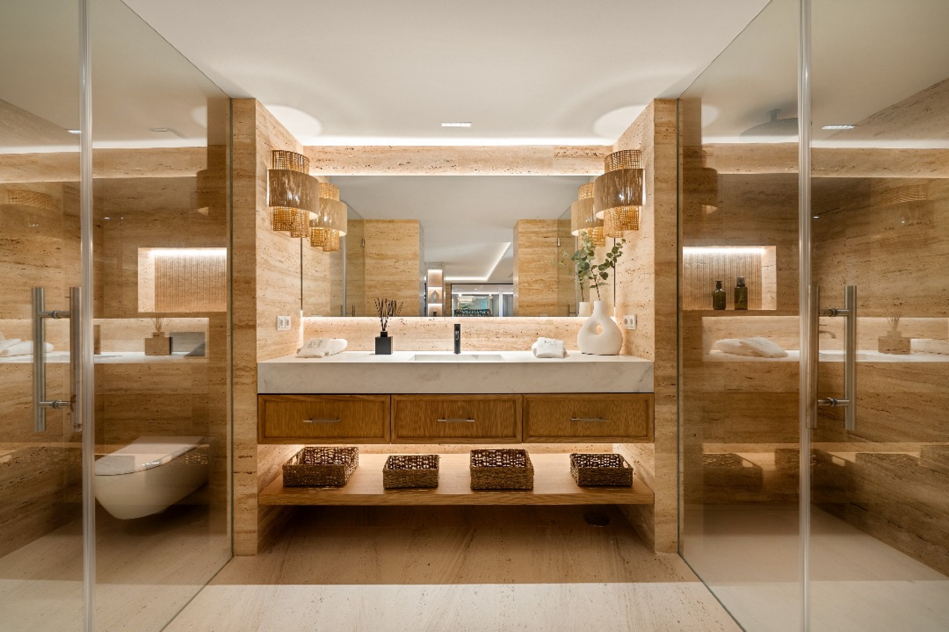 El interior de la villa está diseñado con un enfoque en el lujo y la funcionalidad. Cada uno de los seis dormitorios está equipado con armarios empotrados, proporcionando un amplio espacio de almacenamiento. Los seis baños están diseñados con acabados de alta calidad, asegurando un ambiente de confort y elegancia. La villa cuenta con calefacción por suelo radiante y aire acondicionado, garantizando una temperatura agradable durante todo el año. La cocina está equipada con electrodomésticos de última generación, facilitando las tareas diarias y ofreciendo un espacio ideal para los amantes de la gastronomía. Además, la villa incluye un spa privado, proporcionando un espacio de relajación y bienestar sin necesidad de salir de casa.