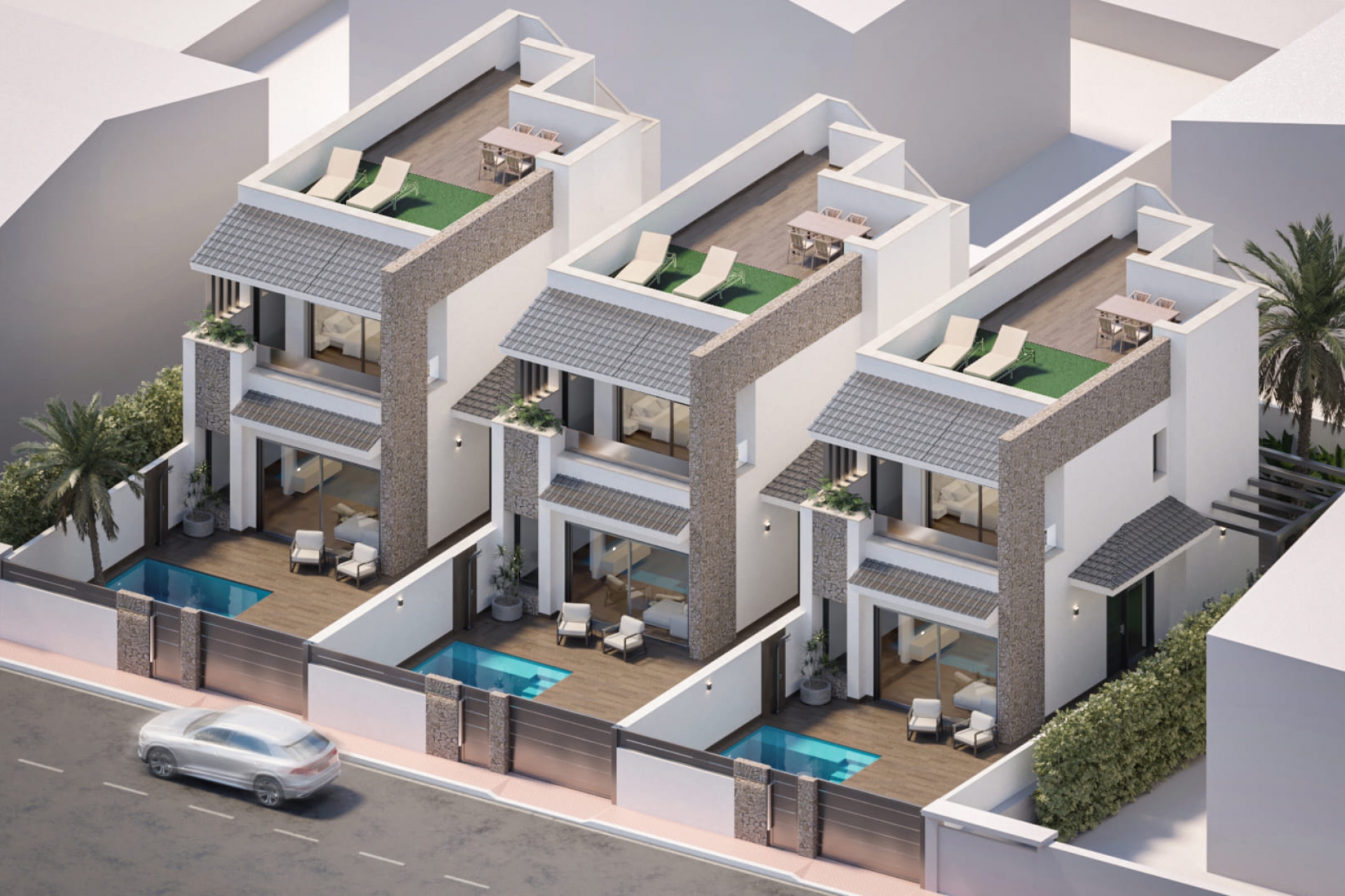 Zewnętrza tych domów szeregowych zostały zaprojektowane, aby maksymalnie wykorzystać śródziemnomorski klimat. Każda nieruchomość posiada prywatny ogród, idealny do spędzania czasu na świeżym powietrzu z rodziną lub przyjaciółmi. Taras, przestronny i dobrze usytuowany, staje się idealnym miejscem do relaksu lub spotkań. Ponadto, domy szeregowe posiadają solarium, oferując dodatkowe miejsce do opalania się i cieszenia się otwartymi widokami. Obecność prywatnego basenu w każdej nieruchomości dodaje luksusu i ekskluzywności, pozwalając na ochłodzenie się w najgorętsze dni.