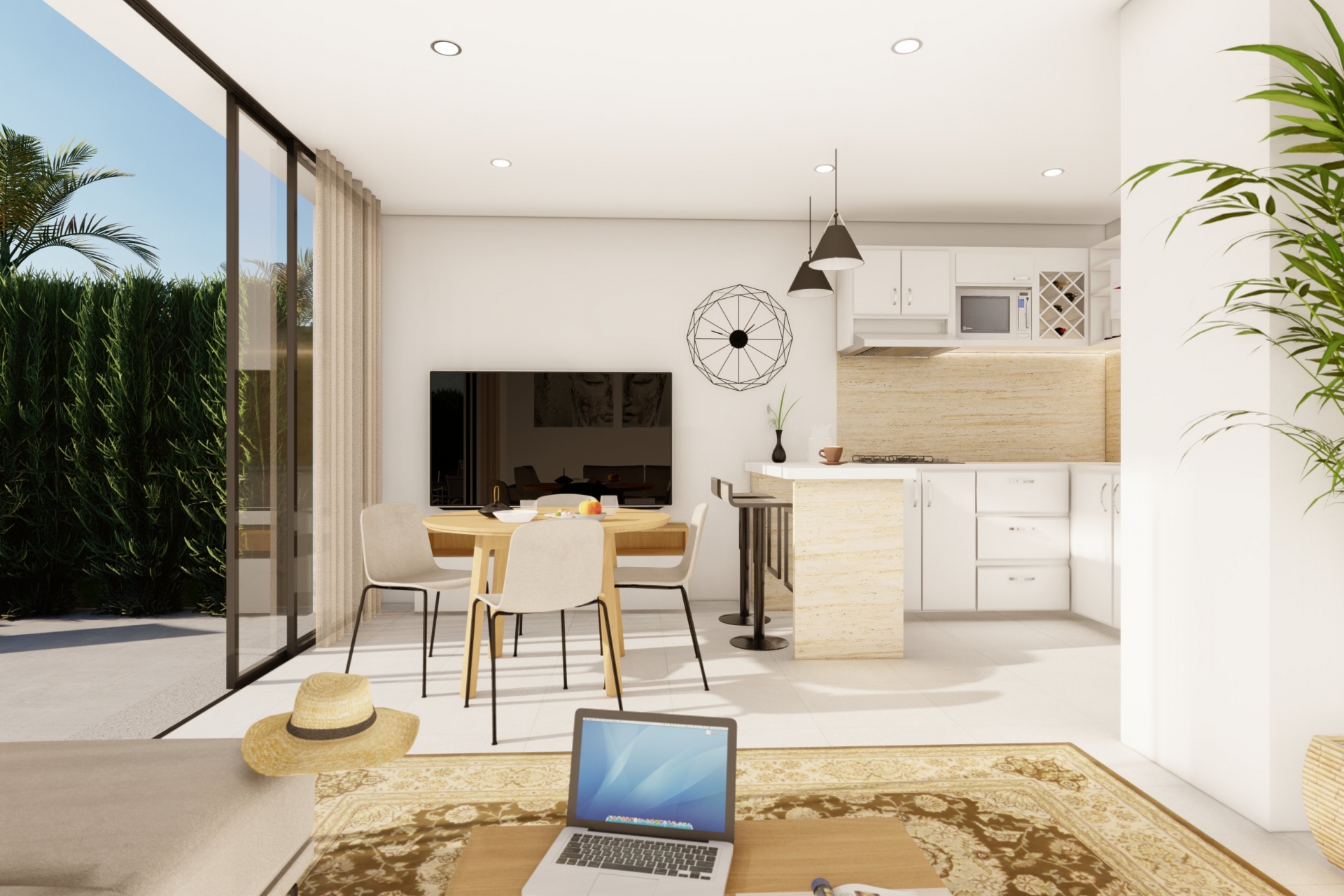 Wnętrze tych niezależnych domów w Murcji zostało starannie zaprojektowane, aby zapewnić maksymalny komfort i funkcjonalność. Ceramiczne podłogi nadają nowoczesny wygląd i są łatwe w utrzymaniu. Domy są w pełni umeblowane, co ułatwia przeprowadzkę i pozwala cieszyć się nowym domem od pierwszego dnia. Elektryczne rolety i wbudowane urządzenia dodają wygody i efektywności na co dzień. Wbudowane szafy oferują dużo miejsca do przechowywania, a wstępna instalacja klimatyzacji zapewnia przyjemną atmosferę przez cały rok.