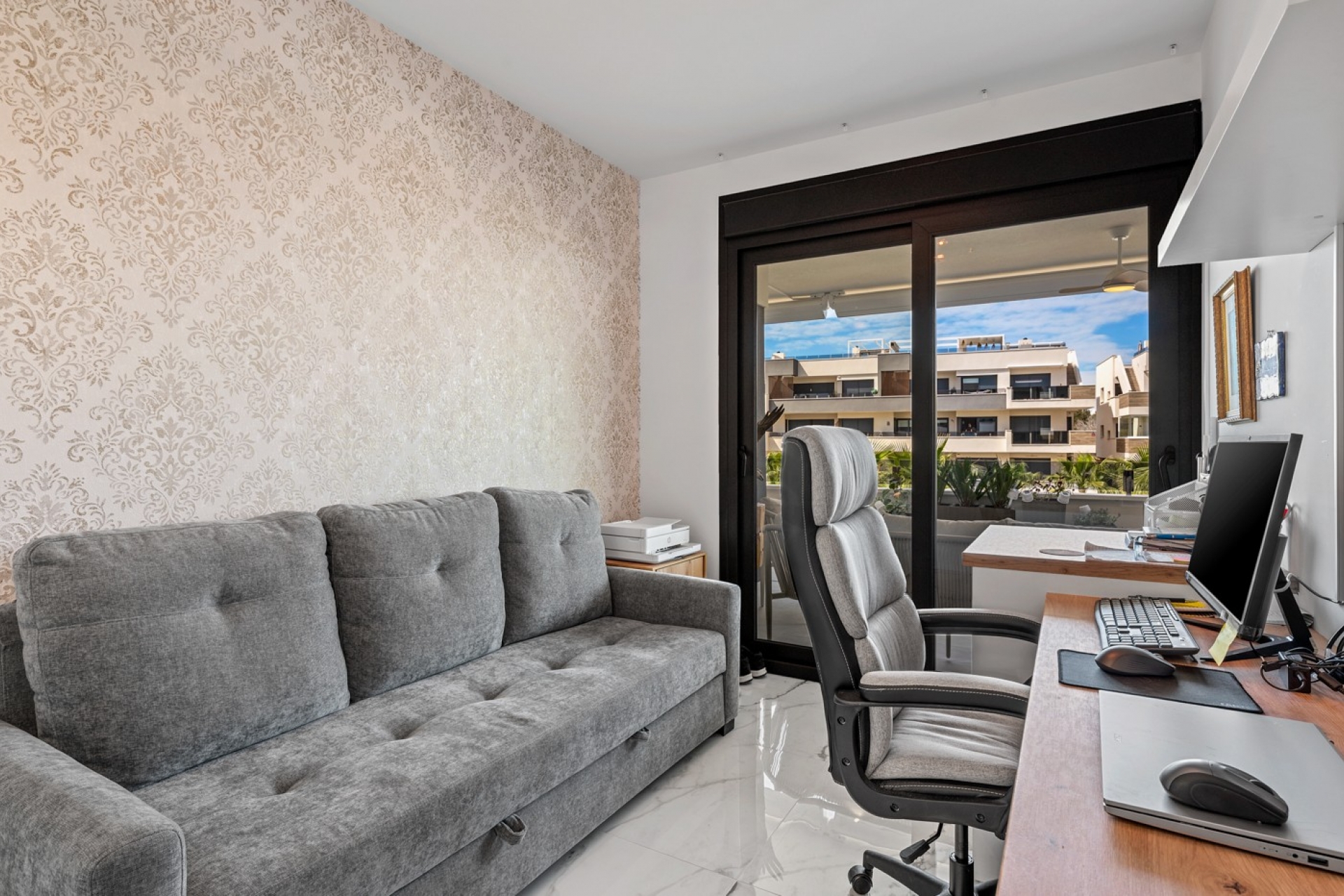 Luksusowy apartament w kompleksie Amanecer X, położony w popularnej dzielnicy Los Altos w Orihuela Costa. Ten nowoczesny i stylowy apartament został ukończony w 2024 roku i stanowi doskonałą okazję jako dom wakacyjny, miejsce do stałego zamieszkania lub inwestycję o wysokim potencjale wynajmu. Apartament posiada jasny, otwarty salon z kuchnią i jadalnią, zaprojektowany tak, aby maksymalnie wykorzystać przestrzeń i naturalne światło. Duże okna tworzą przestronną atmosferę i zapewniają bezpośredni dostęp do dużego prywatnego tarasu, łącząc wnętrze z przestrzenią zewnętrzną. Kuchnia jest w pełni wyposażona w nowoczesne urządzenia i wykończona w eleganckim, współczesnym stylu. Do dyspozycji są dwie przestronne sypialnie z wbudowanymi szafami, położone od strony tarasu, oraz dwie nowoczesne łazienki wykończone w wysokim standardzie. Apartament sprzedawany jest w pełni umeblowany i ma powierzchnię 65 m² z funkcjonalnym układem. Jednym z największych atutów jest duży prywatny taras o powierzchni ponad 25 m² z widokiem na zadbane ogrody i wspólny basen. Dzięki orientacji południowo-zachodniej taras jest doskonale nasłoneczniony i idealny do relaksu lub spożywania posiłków na świeżym powietrzu. Apartament znajduje się na pierwszym piętrze budynku nr 8 z windą i obejmuje miejsce parkingowe w garażu podziemnym oraz komórkę lokatorską. Wyposażony jest w klimatyzację, system Airzone, ogrzewanie podłogowe w łazienkach oraz elektryczne rolety, co zapewnia komfort przez cały rok.